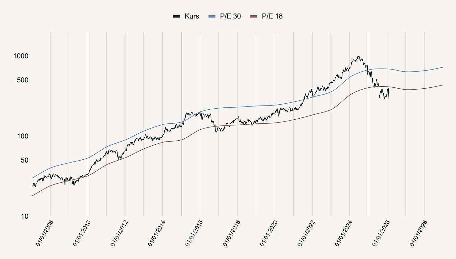 Omvendt har aktien i perioder som 2015 og 2021-2024 handlet over den øvre grænse på P/E=30. Det var perioder med store vækstforventninger.