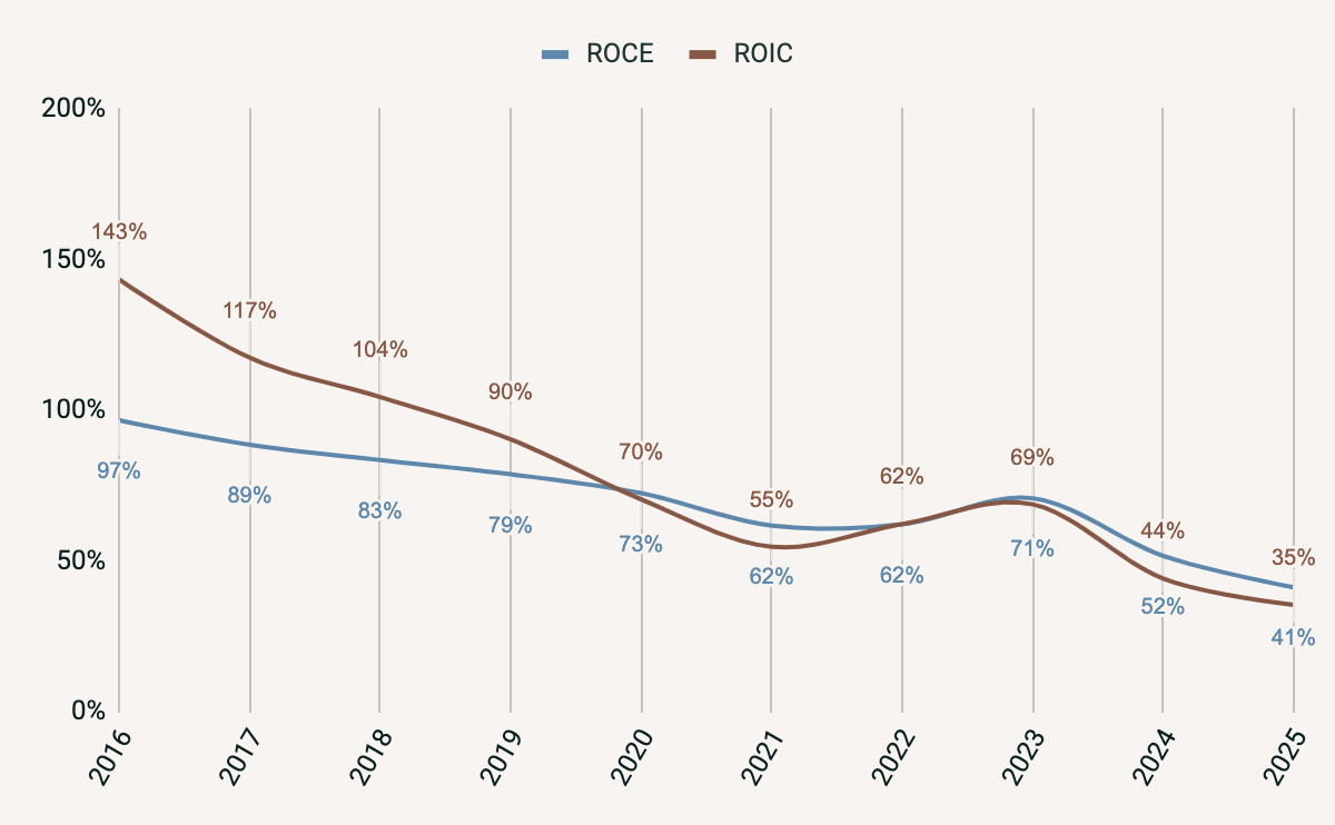 Grafen viser ROCE og ROIC for Novo Nordisk for perioden 2016-2025.