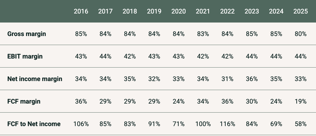 Alle margins er isoleret set gode. Forretningsmodellen er effektiv og en stor del af omsætningen går ned på bundlinjen, og bliver videreført til cash flow.