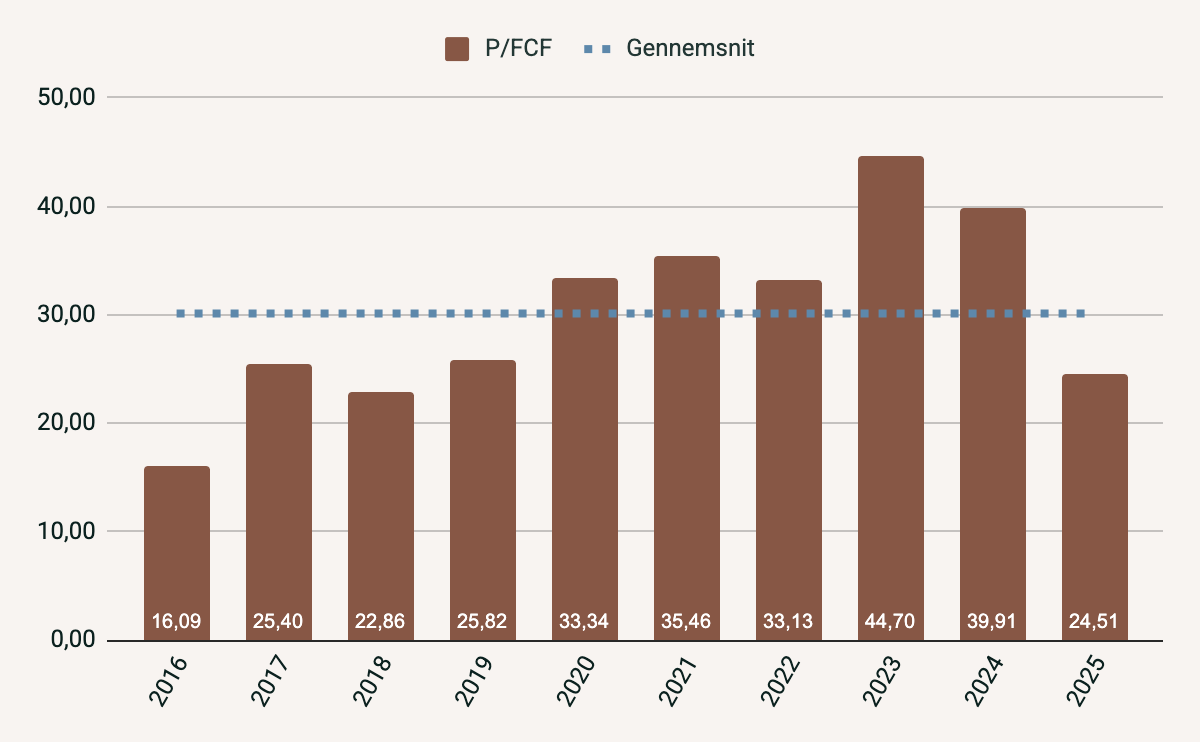 P/FCF viser samme billede som P/E og handles i dag på 24,51. Det er under gennemsnittet på 30,16.