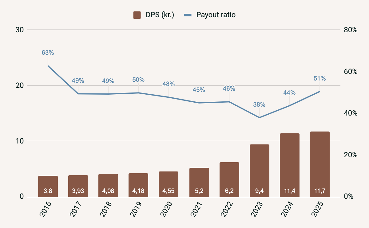 Payout Ratio ligger på et stabilt niveau og udgjorde 51% i 2025, hvilket viser en balanceret tilgang mellem at belønne aktionærerne og samtidig fastholde kapital til investeringer og vækst.