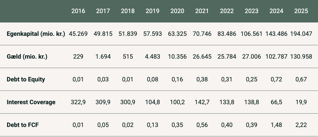 Tabellen viser egenkapital, gæld, Debt to Equity, Interest Coverage og Debt to FCF for Novo Nordisk for perioden 2016-2025.