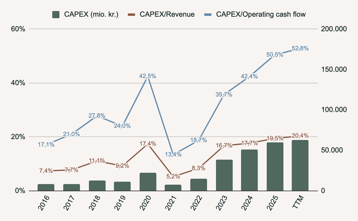 Det ses tydeligt, at der investeres mere og mere i CAPEX. Investeringerne i CAPEX stiger hurtigere end både omsætningen og operating cash flow.