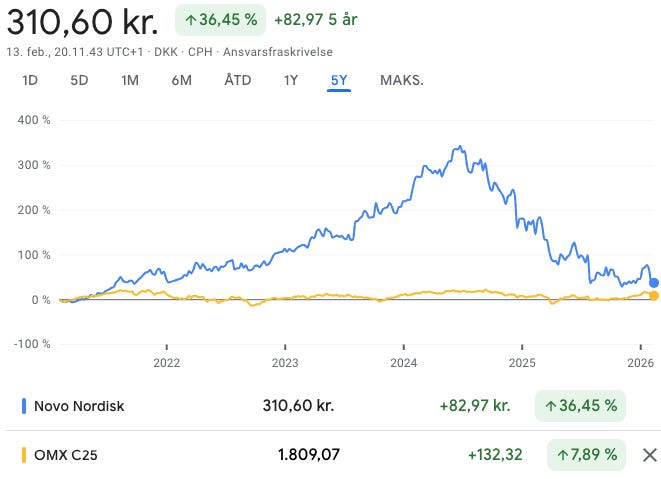 De seneste 5 år har Novo Nordisk givet et afkast på 36,45%.