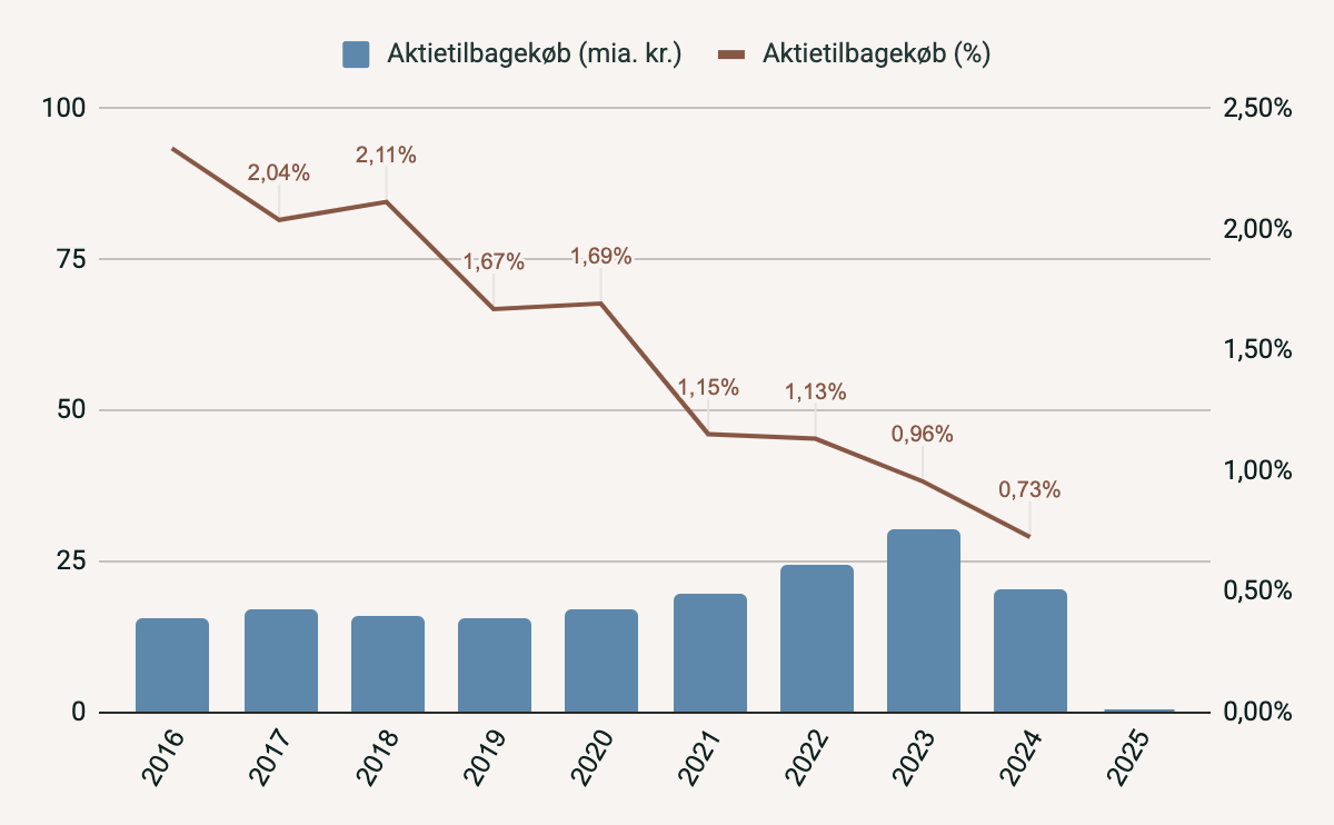 Et stort aktietilbagekøb ville ellers have stor effekt nu hvor aktiekursen er banket i bund. Og det virker underligt at man laver store aktietilbagekøb de seneste år hvor kursen har været høj og slet ikke nu hvor kursen er lav. De har dog annonceret et aktietilbagekøb på 15 mia. kr. for 2026.