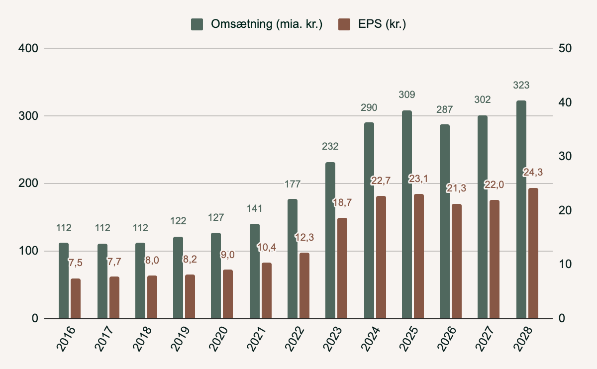 EPS følger omsætningen og er vokset fra 7,5 kr. i 2016 til 23,1 kr. i 2025.