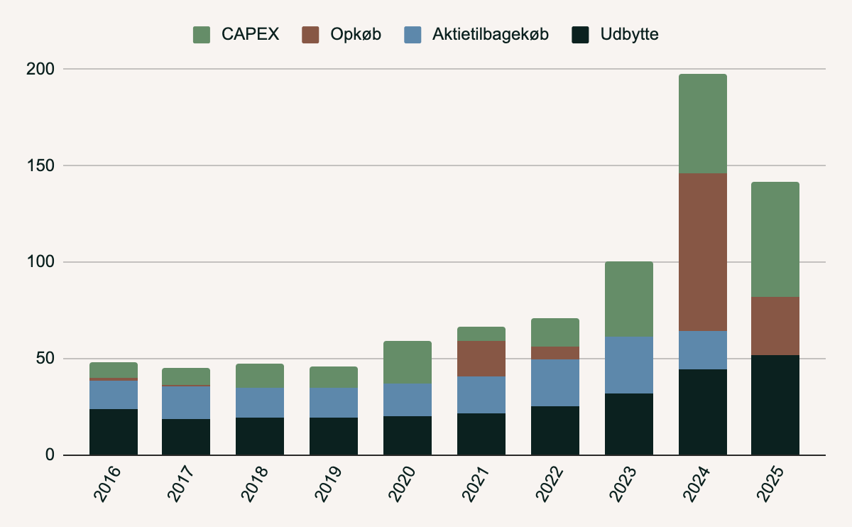 I 2025 gennemførte selskabet ikke noget aktietilbagekøb. Pengene er brugt på udbytte, opkøb og CAPEX.